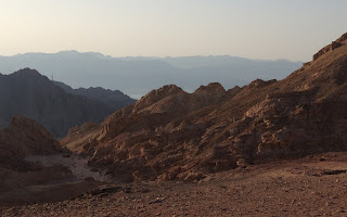 Here's the view to the east-southeast. On the left you can see a bit of the "upper valley" we came through. Behind that is the rugged mountain the other side of Nakhal Shlomo. Further back, you can see a tiny bit of the Red Sea, and, beyond that, the mountains in Jordan.